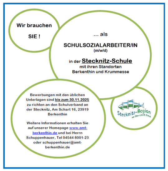 Die Grund- und Gemeinschaftsschule Stecknitz mit 950 Schülern in den Klassenstufen 1-10 sucht eine engagierte und qualifizierte Fachkraft für die Schulsozialarbeit, um das Wohlbefinden und die